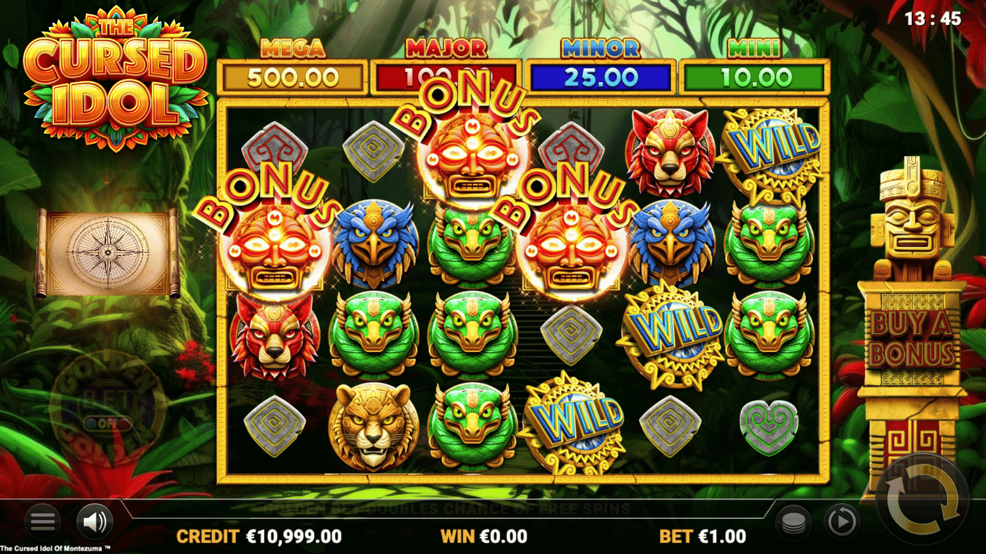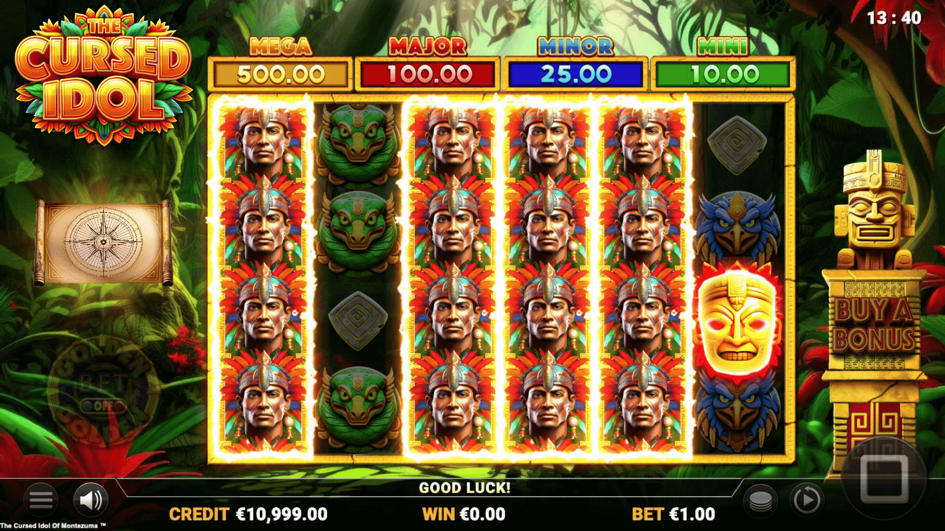 The Montezuma Mystery Prize is triggered when full stacks of Montezuma symbols land on reels 1–5 and the Cursed Idol symbol appears on reel 6. Each full stack transforms into a spinning reel, awarding a random cash multiplier or one of four jackpot —Mini, Minor, Major, or Epic.