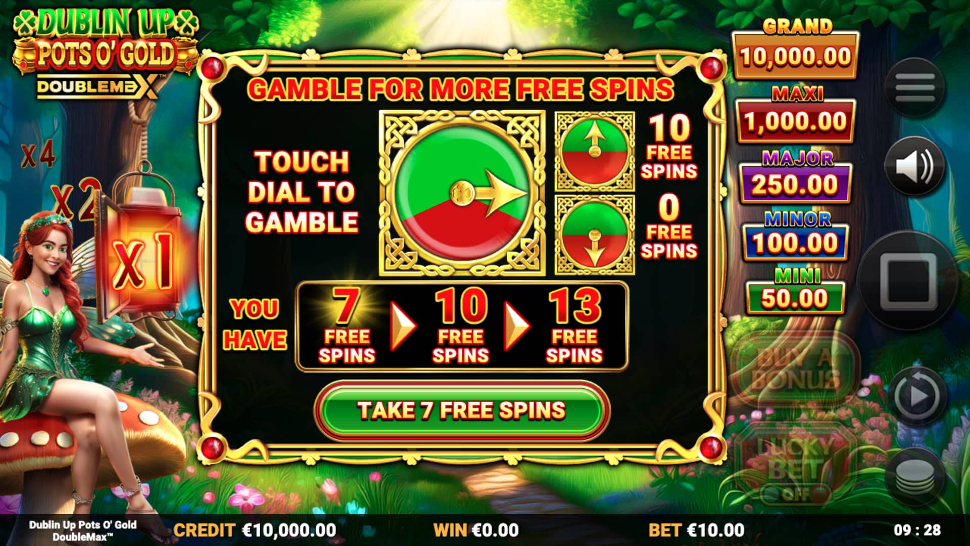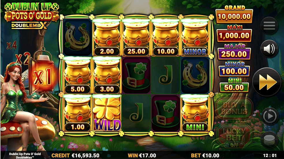 Dublin Up Pots O' Gold features Pots O' Gold prizes. Rather than paying on win-lines, these pay in view when on three or more consecutive reels linked to the left-most reel. The sum total of all pots linked to the left-most reel are paid at the end of any cascade sequence, are not eliminated to create a further cascade and are not multiplied up by the DoubleMax Multiplier. Wild symbols may bridge a gap to a Pot symbol on a subsequent reel to the right but do not pay and only do so at the conclusion of a cascade sequence. Pot prizes on the first four reels can be 0.1, 0.2, 0.3, 0.4, 0.5, 1, 1.5, 2, 2.5, 3, 4, 5, 10 times the base stake. On the 5th reel Prize Pots can land. These are MINI, MINOR, MAJOR, MAXI or GRAND and award 5, 10, 25, 100 or 1000 times the base stake respectively.