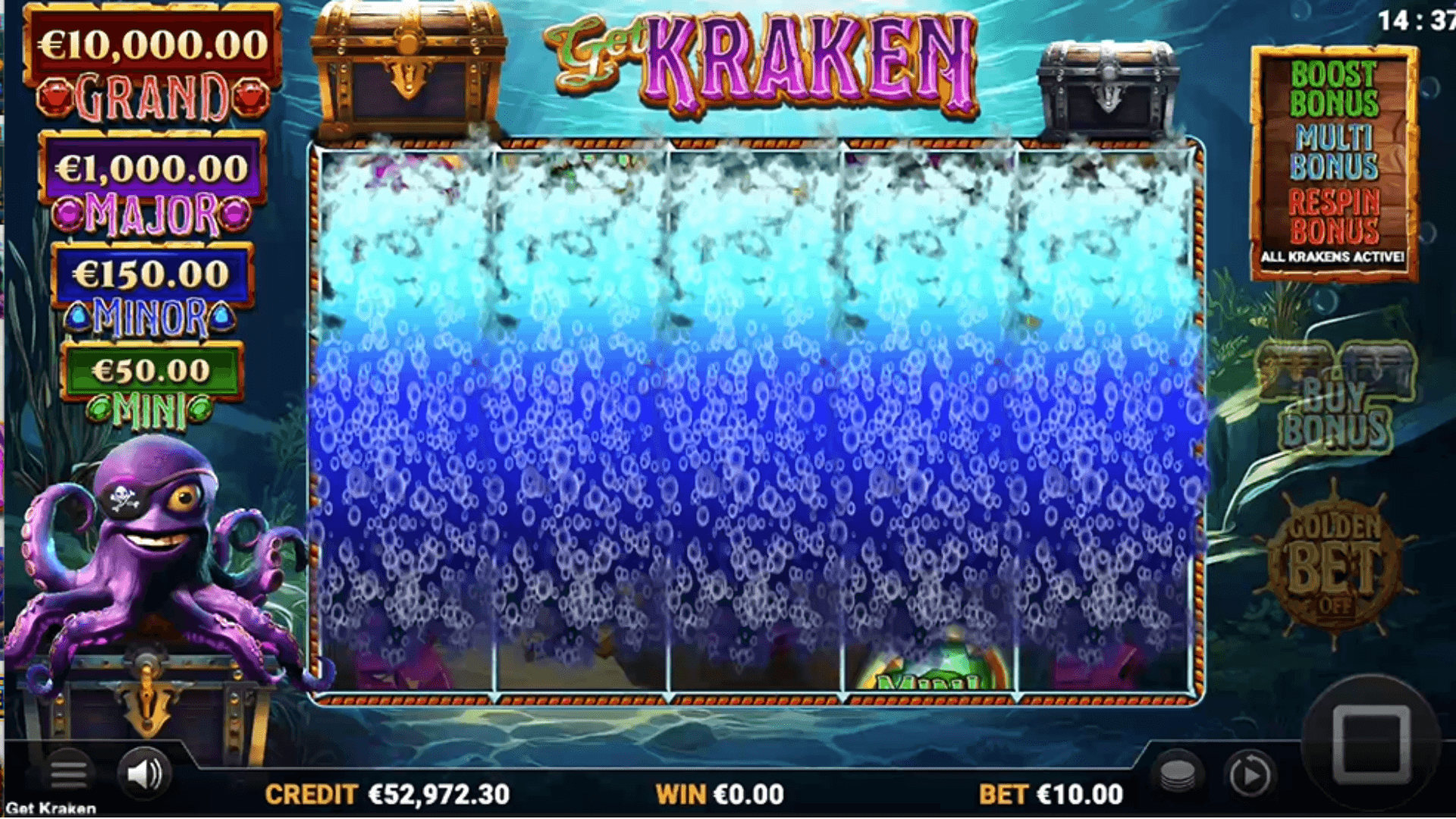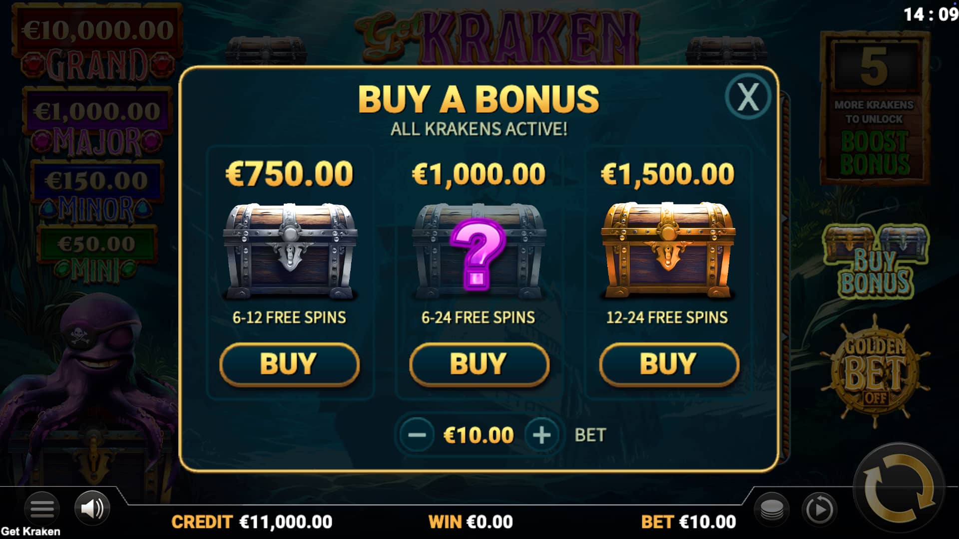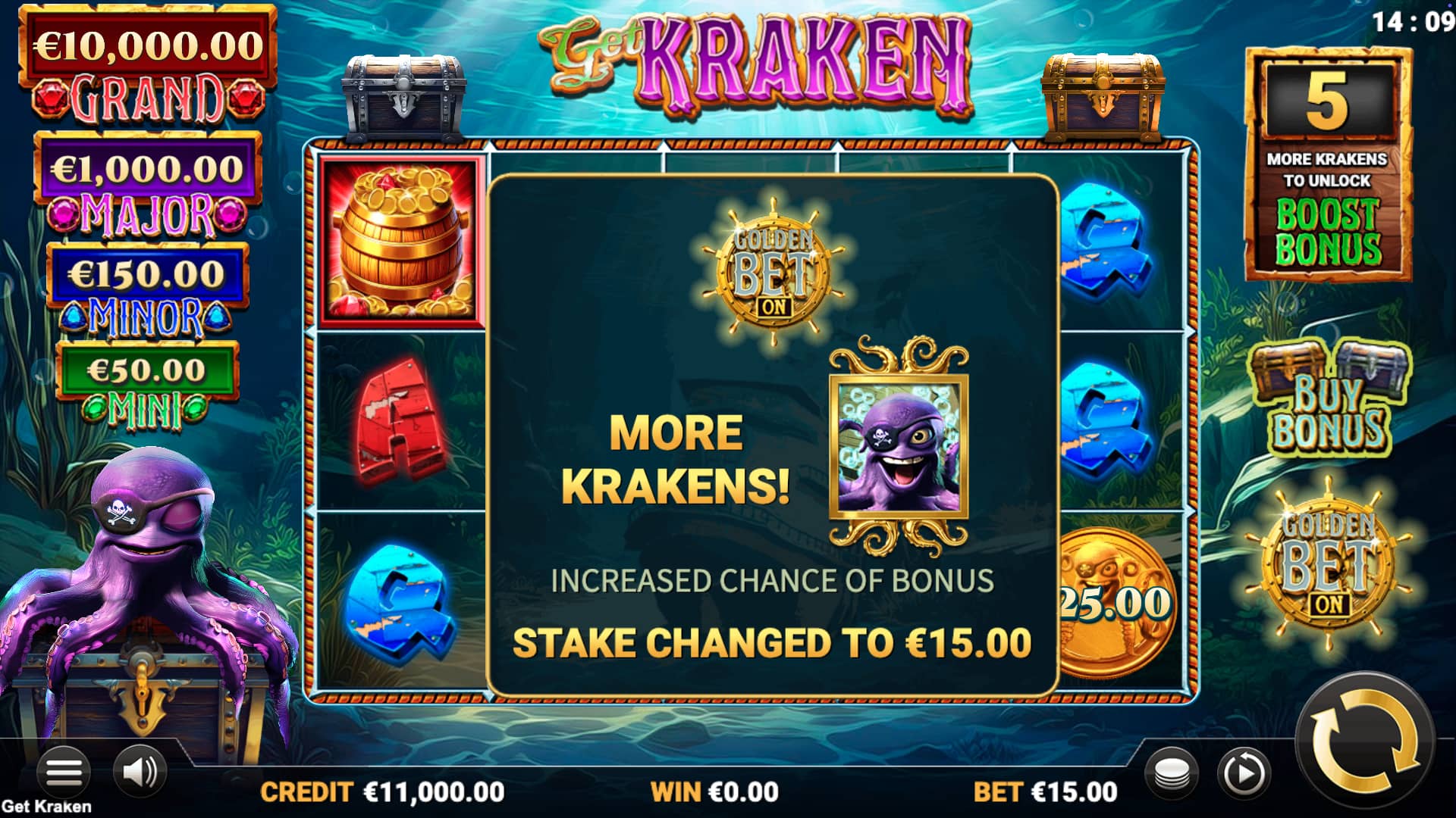 For 1.5x standard bet, Golden Bet can be activated. This increases the chance of the Kraken landing, making collections and the Free Spins bonus more frequent. It also guarantees the right treasure chest is always golden. Treasure chest size, paytable values and coin/gem awards remain unchanged.