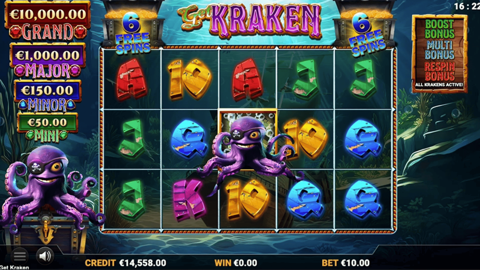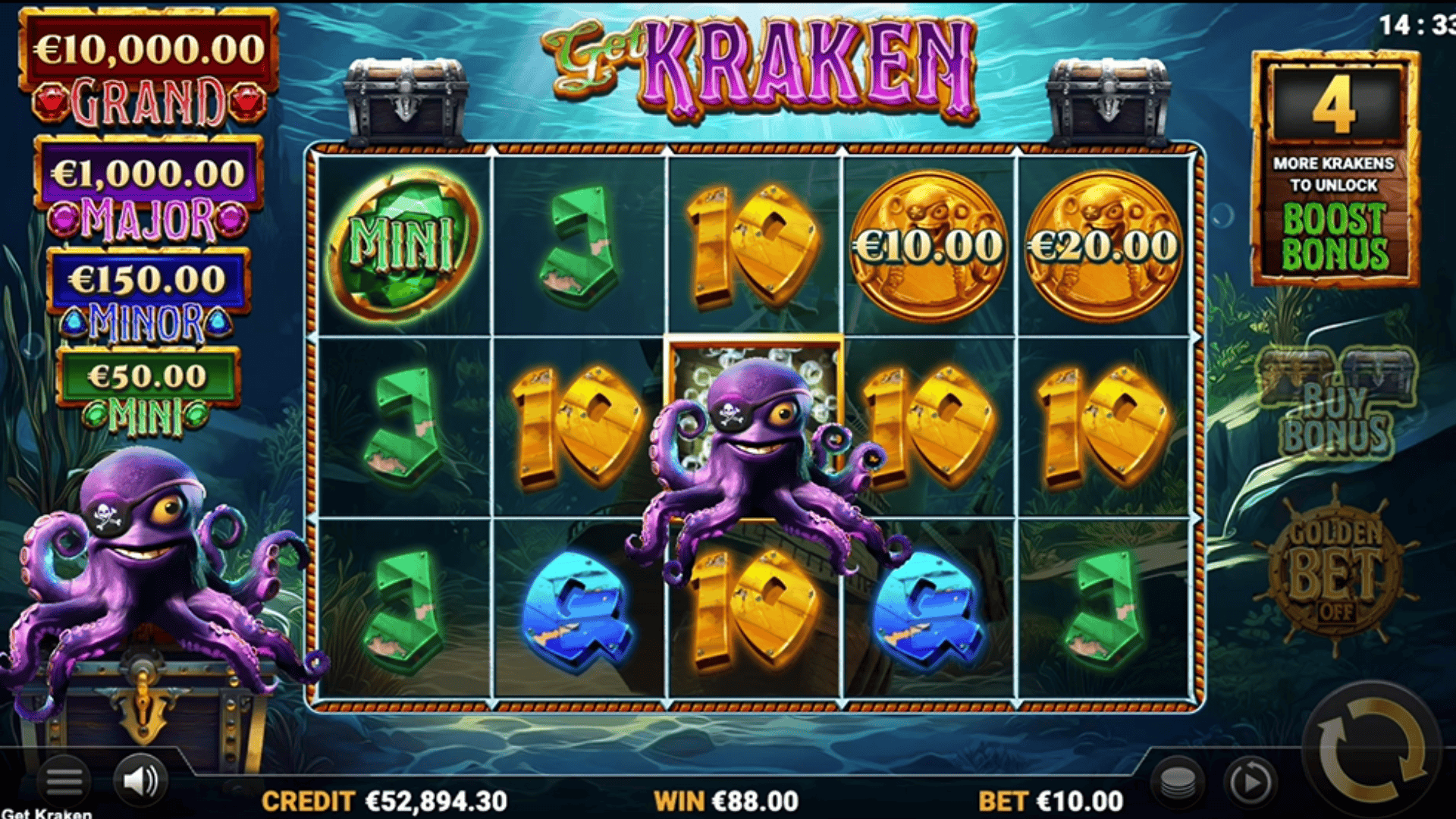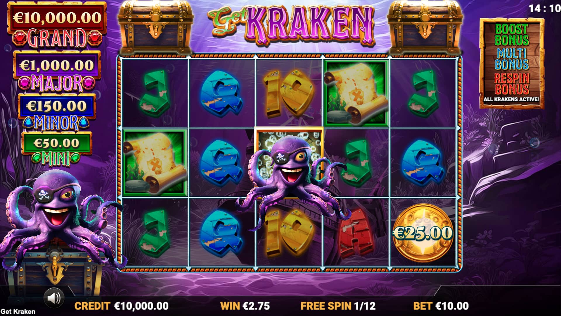 Get Kraken is a vibrant undersea treasure game packed with big win potential. The Kraken Wild sits at the heart of the action on a dedicated centre reel position, collecting Coins and Gems with every landing. Four coloured Gem symbols unlock MINI, MINOR, MAJOR and GRAND pot prizes, while three progressive Kraken features: BOOST, MULTIPLY or RESPIN will keep players hooked.
