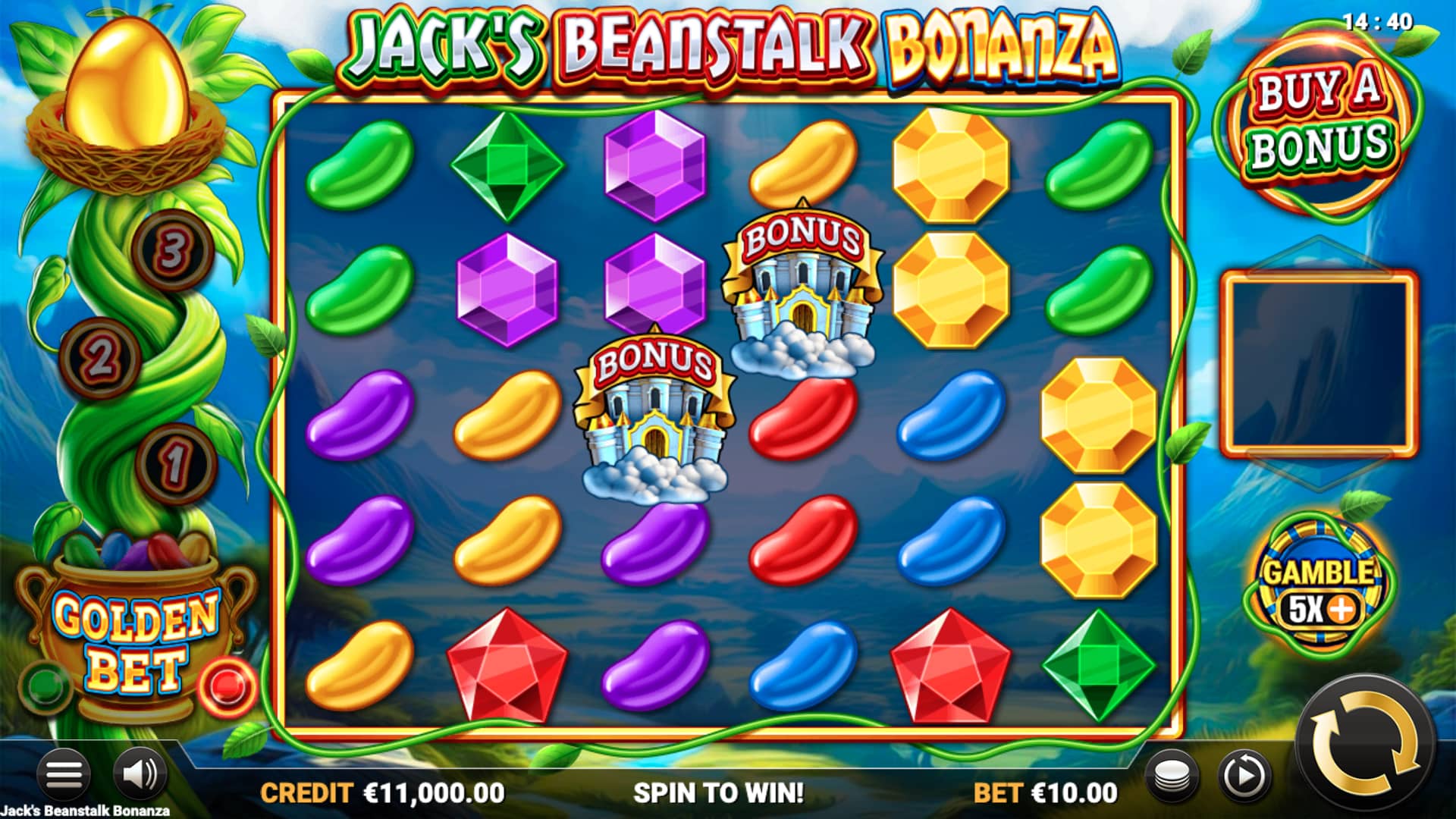 Climb skyward with Jack in Jack’s Beanstalk Bonanza and uncover treasures beyond the clouds! Symbols pay anywhere in view, with winning ones disappearing as new symbols cascade from above. Special Magic Bean symbols act as Wilds and substitute for all symbols except the Bonus, while giant pay or wild symbols can land, counting as 4 or 9 standard-sized symbols. Each cascade takes you higher up the Beanstalk, reach the top to crack open the Golden Egg for extra Bonus symbols or a win multiplier of up to 1000x! Feeling bold? Try the Dual Gamble to boost base game winnings or leap straight into the Bonus. Activate Golden Bet to increase your stake by 25% and enhance your chances of triggering Free Spins!