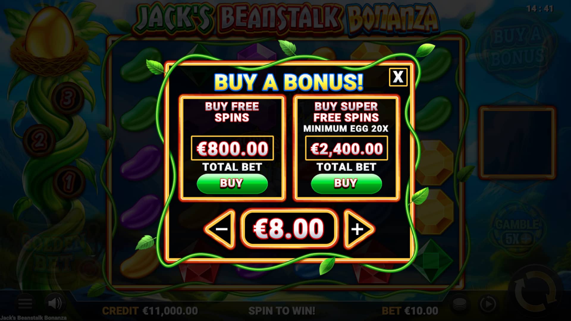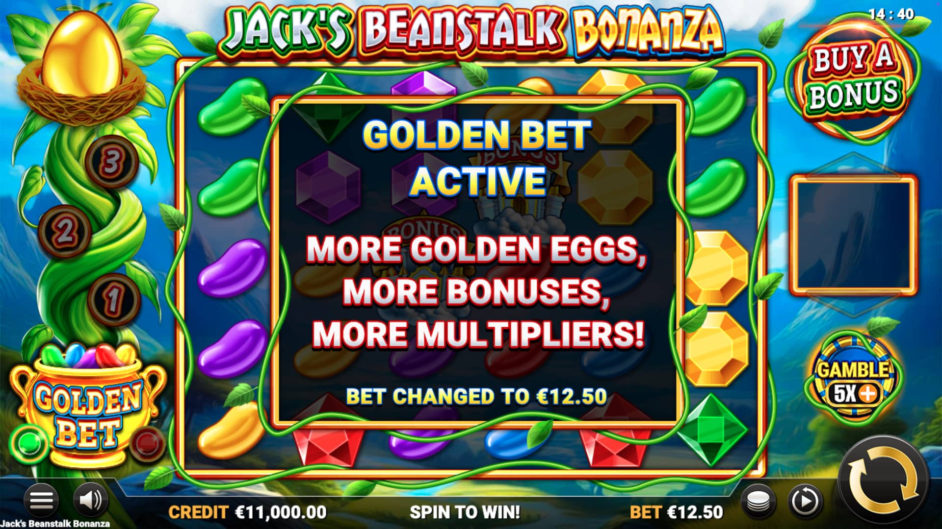 There is the option for a player to increase their bet by 1.25x, this increases the chance of climbing to the top of the Beanstalk, increasing the chance of Egg multipliers and triggering the Free Spins bonus.