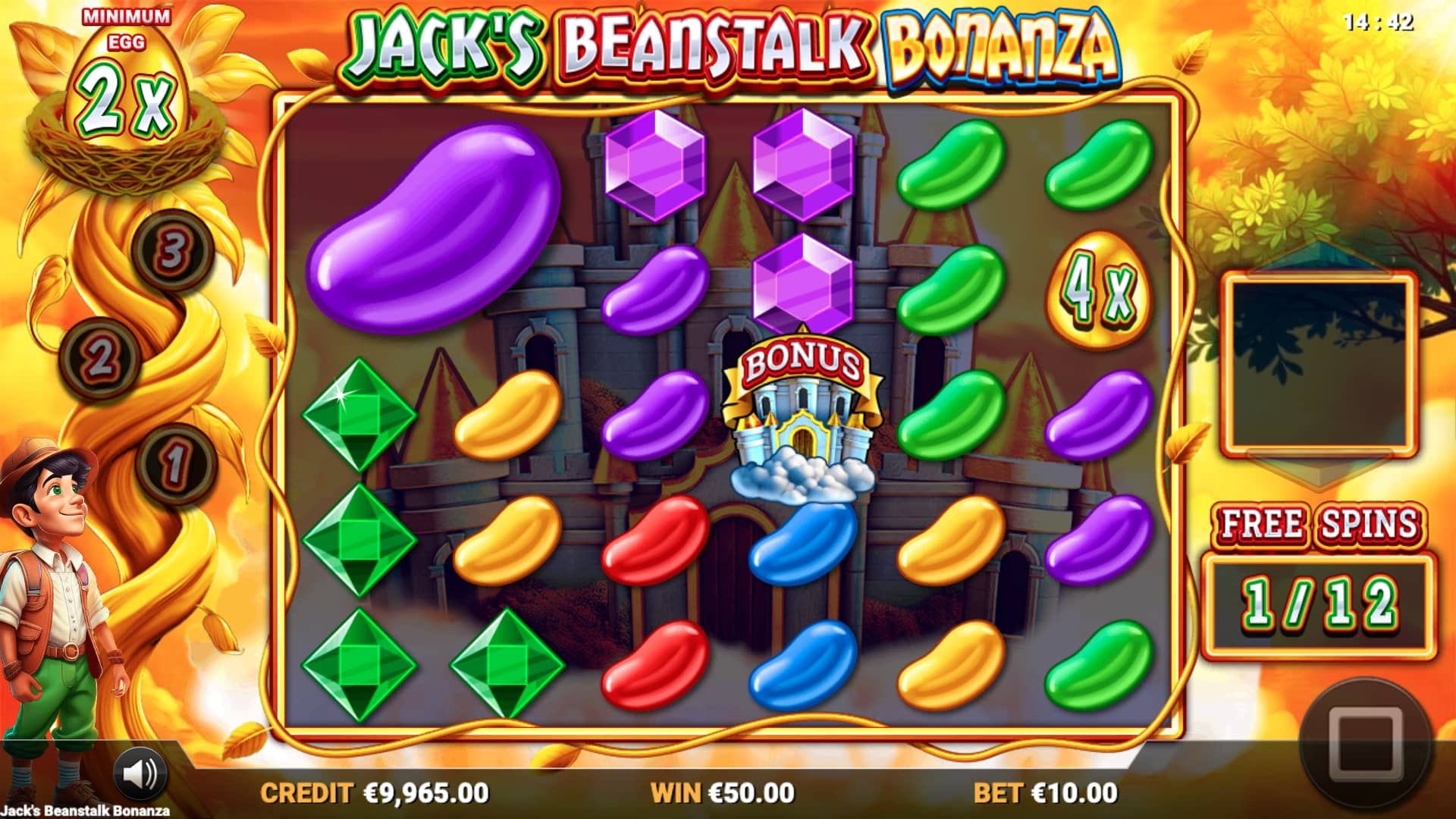 A golden version of the Beanstalk is in play during the Free Spins bonus; at the top a Golden Egg is shown displaying the minimum multiplier that any eggs landing on the reels can display. This can be climbed multiple times to increase the minimum egg multiplier to 100x.