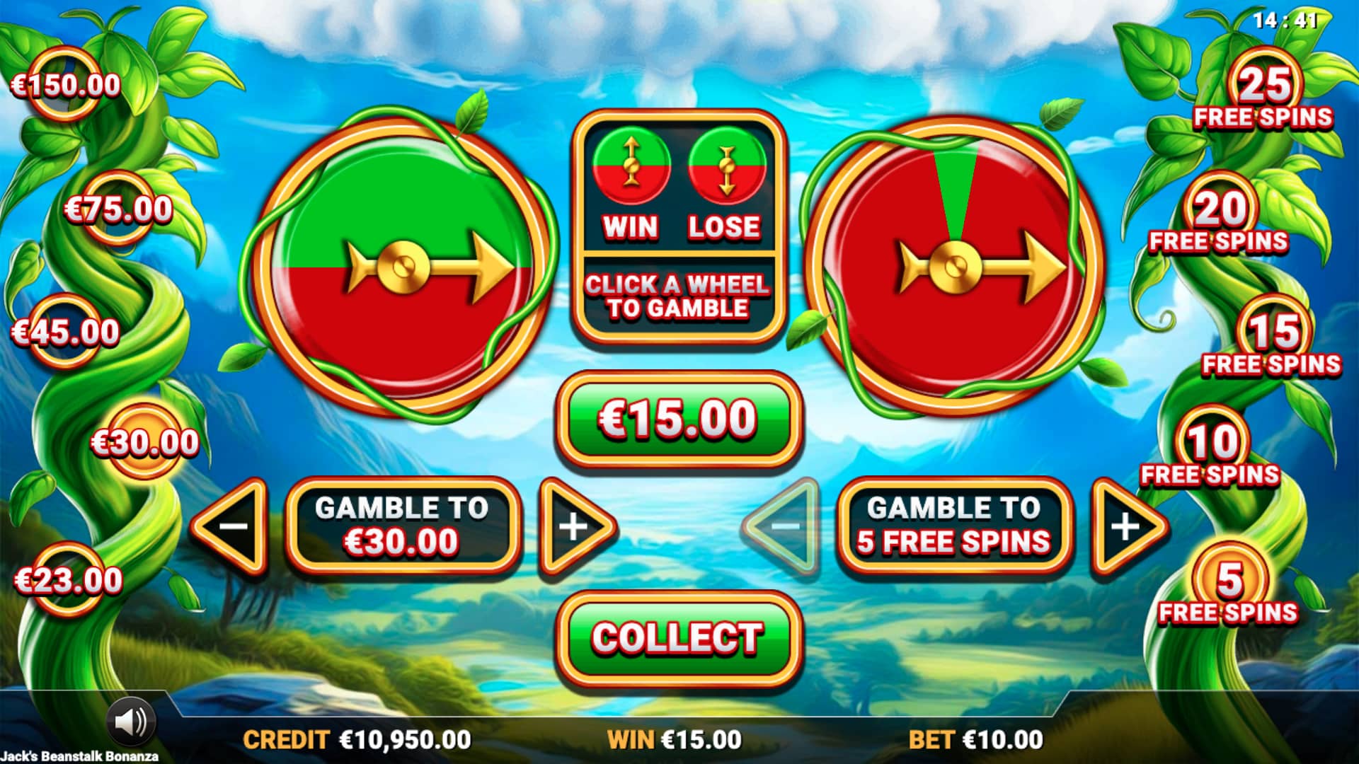 The left wheel can be used to gamble for bigger cash prizes, the right wheel can be used to gamble for Free spins.